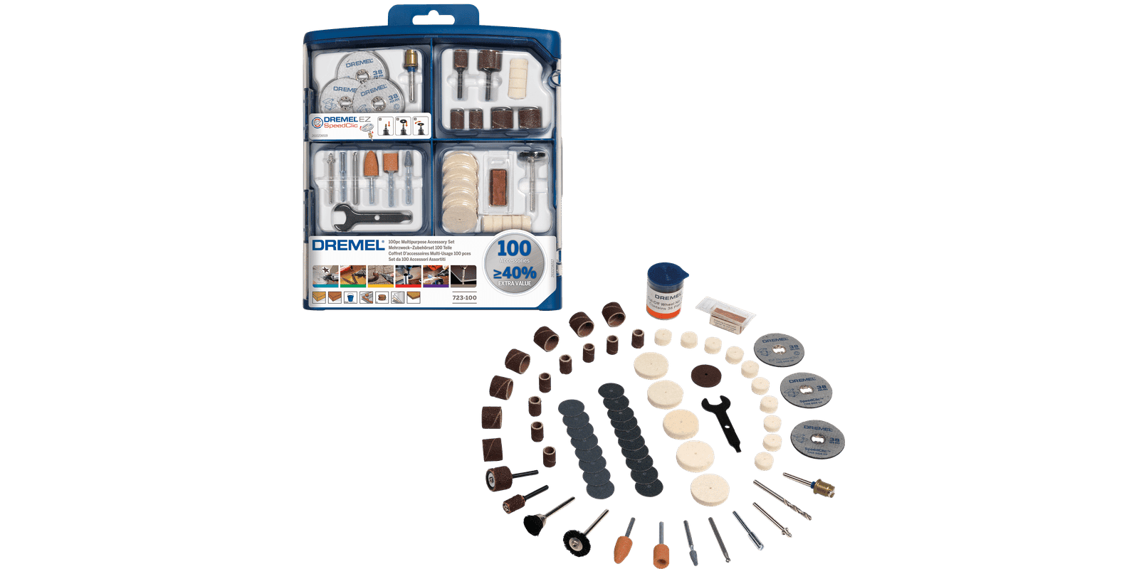 ערכת התחלה אידאלית של Dremel עם 100 אביזרים ליישומים וחומרים שונים.