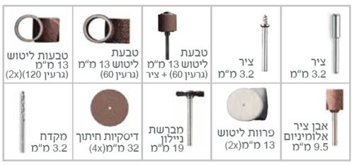 • 15 אביזרים ייחודיים: חיתוך, שיוף, ניקוי, חריטה ועוד – כולל ראשי עבודה שמתאימים לכל מטרה